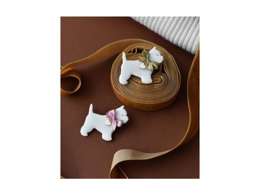 Brošňa psíka West highland white teriér s mašľou a príveskom v tvare srdiečka.