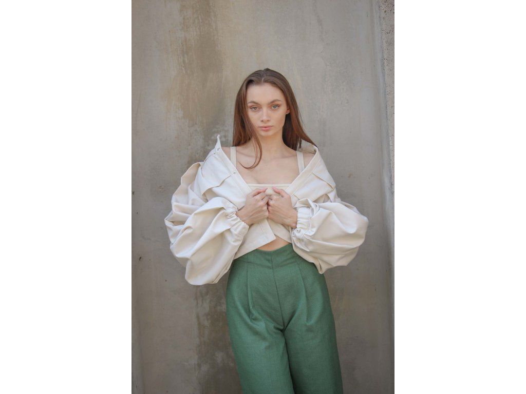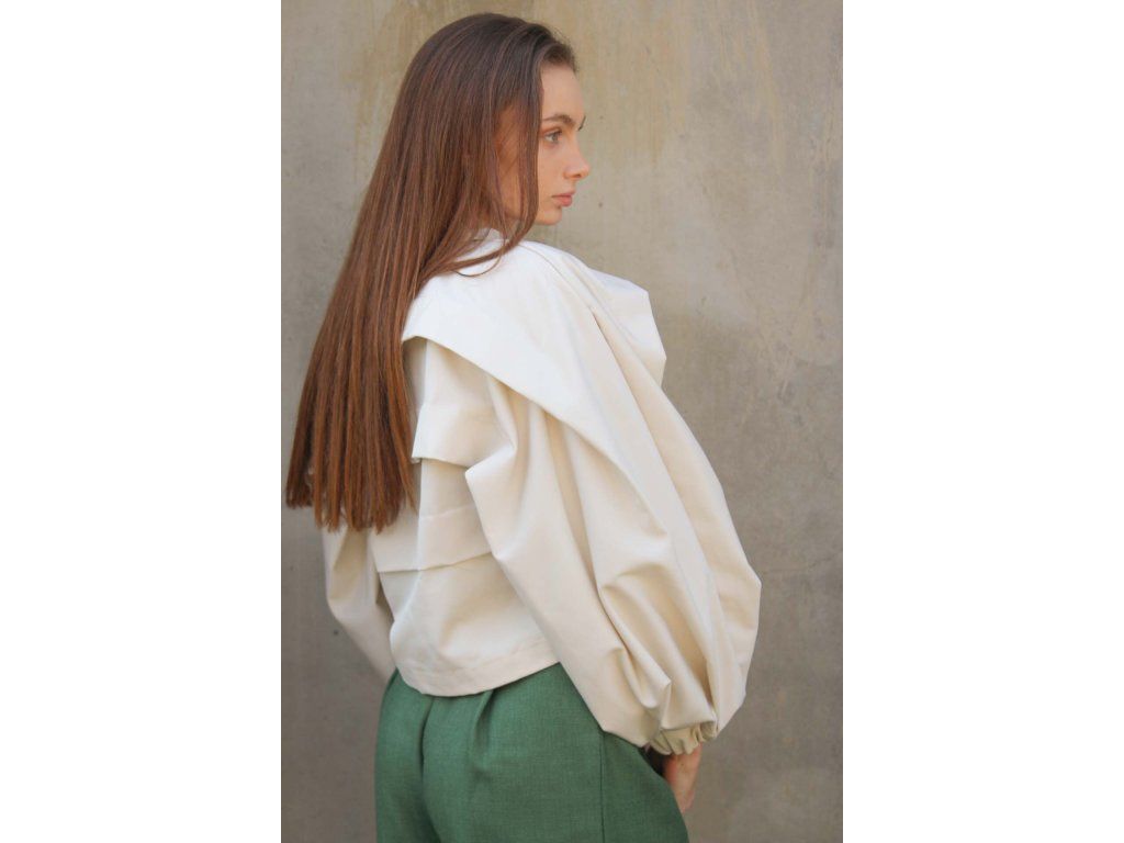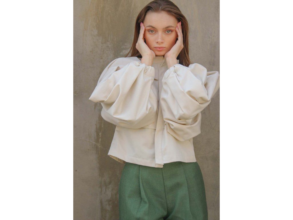 Dominantným prvkom sú bohaté rukávy, ktoré pôsobia elegantne a voľne, pričom sú zakončené jemnou gumičkou, vďaka čomu krásne sedia na zápästí a zároveň dodávajú bunde charakter.