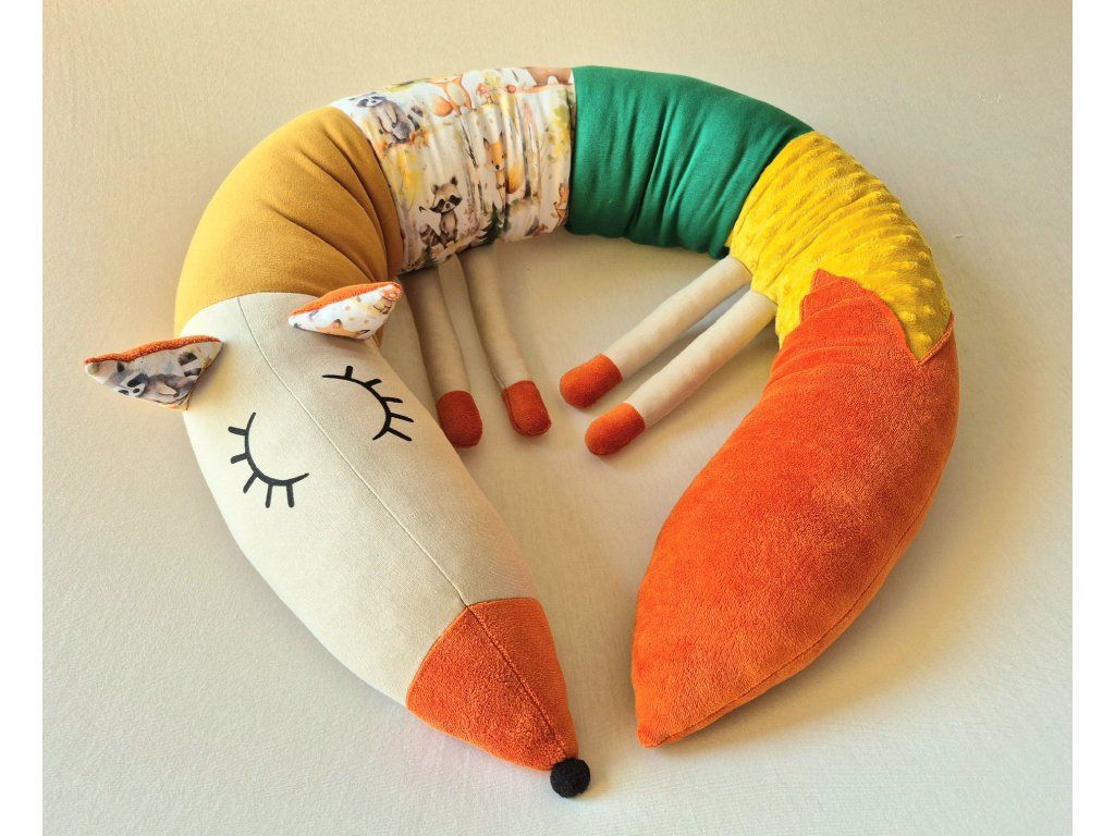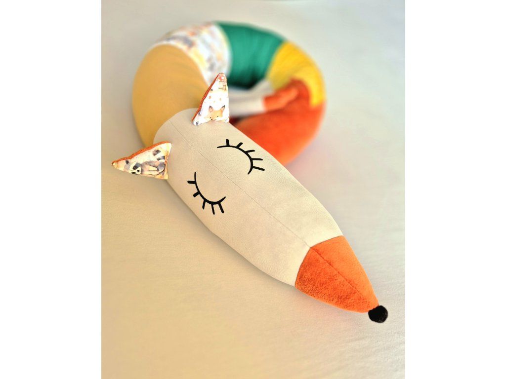 Kombinácia mäkučkej teplákoviny, plyšu a minky. Lišiak je vyplnený dutým vláknom (antialergické guľôčky). Noštek tvorí čierny brmbolec a očká sú namaľované čiernou farbou na textil.