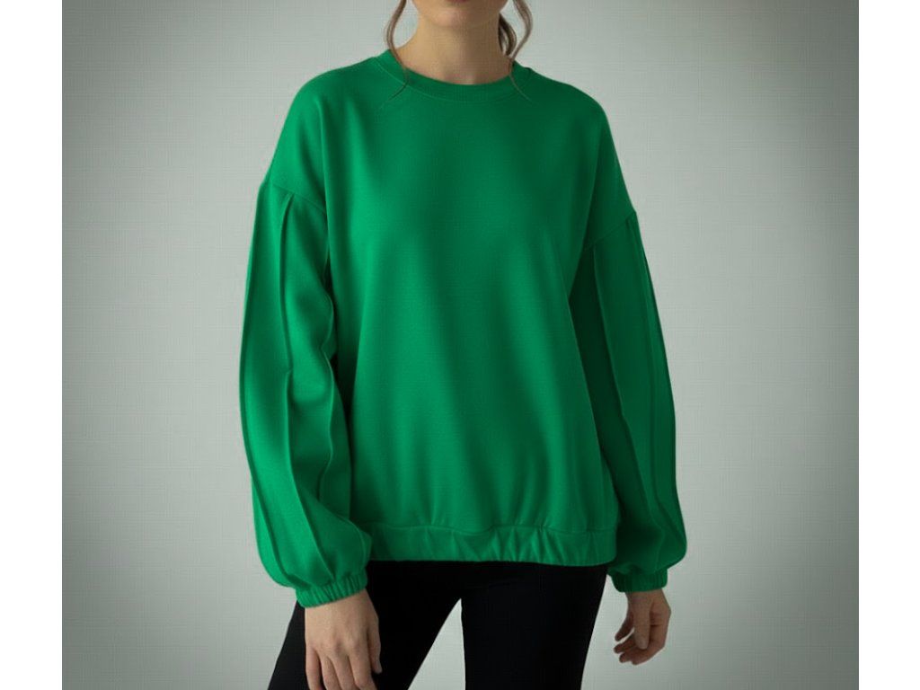 Bohaté rukávy sú starostlivo formované a zdobené jemným, rovnomerným prešívaním, ktoré im dodáva jedinečnú štruktúru a charakter. Ich zakončenie v gumičke vytvára elegantné,p riasenie – detail, ktorý pôsobí sofistikovane a zároveň veľmi moderne. Dolný okraj mikiny je tiež zakončený v gumičke .