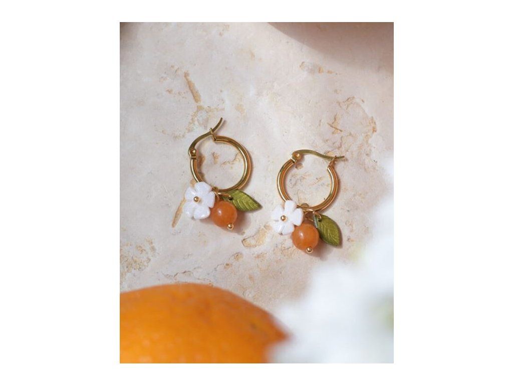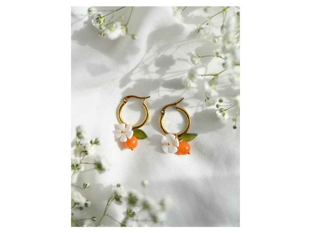 Mandarinkové náušničky s ručne robeným polymérovým lístkom a kvietkom.