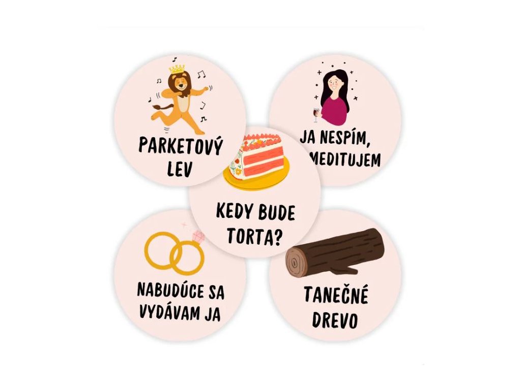 Pýtate sa, čo to vlastne je? Vtipné nálepky na svadbu sú skvelým doplnkom k svadobným hrám, fotokútiku či ako zábava na svadobnej hostine. Každý si nájde tú svoju od "parketového leva“ až po „tanečné drevo“. Jednoducho si ich hostia nalepia na sako, šaty alebo čelo – a zábava sa môže začať!