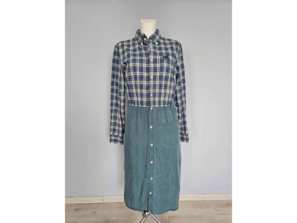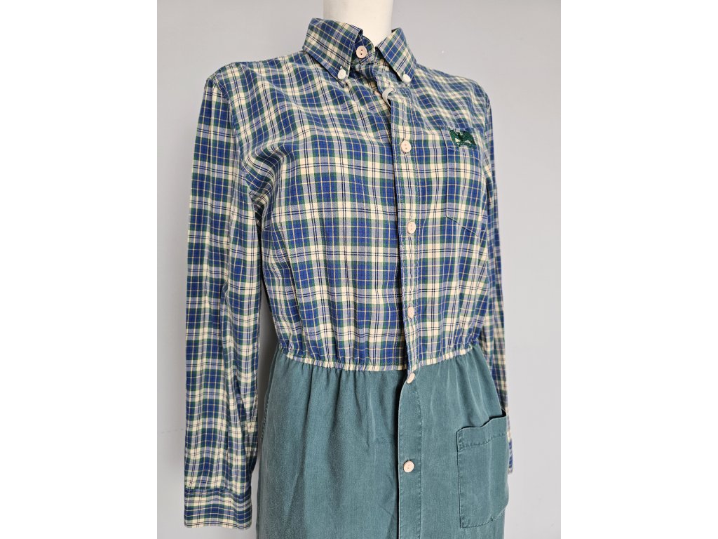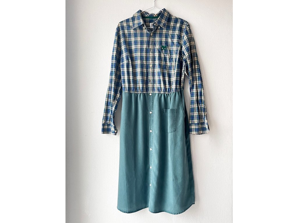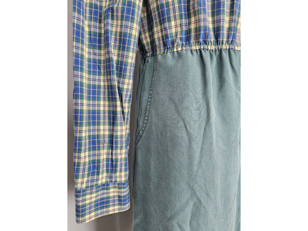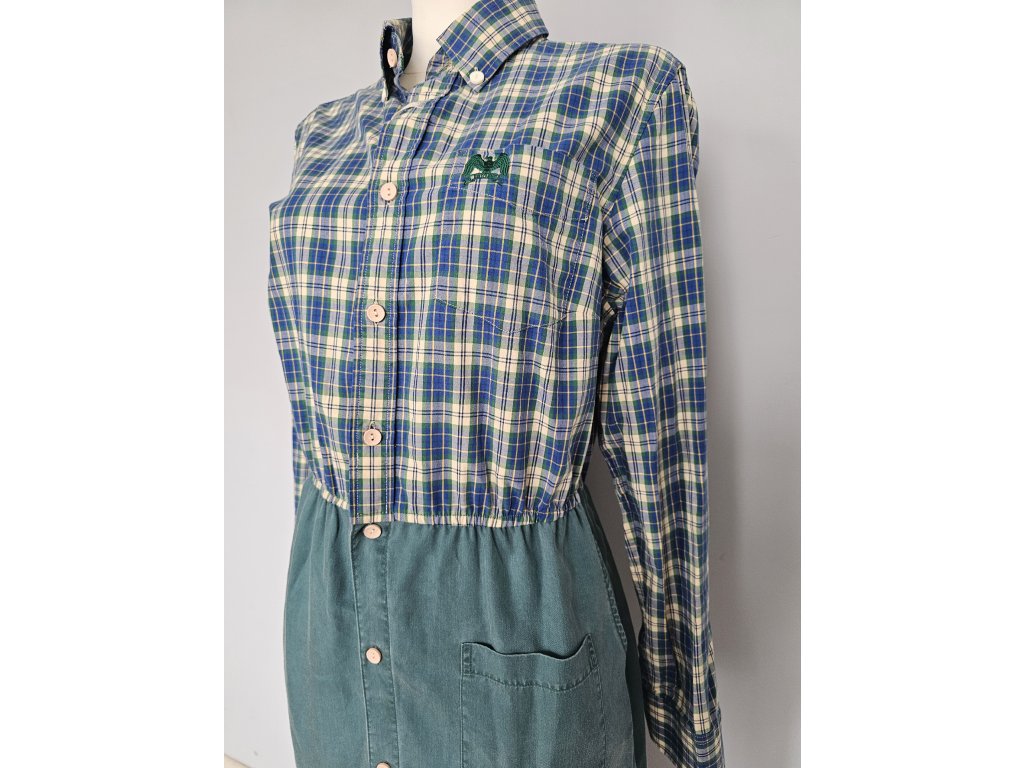 Upcyklované zelené šaty s vreckami a na zapínanie.
