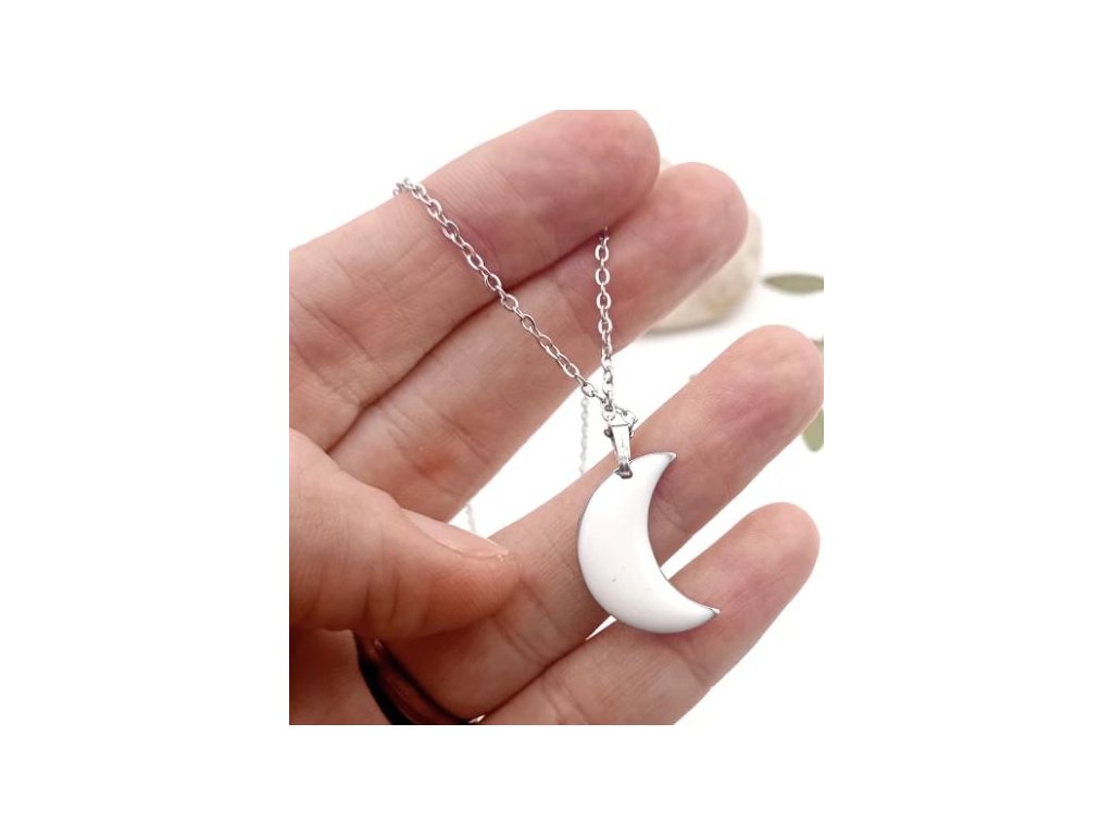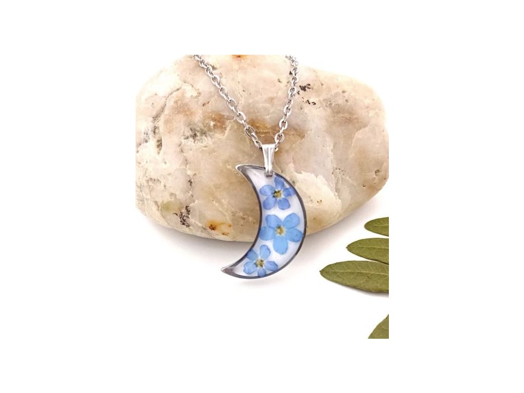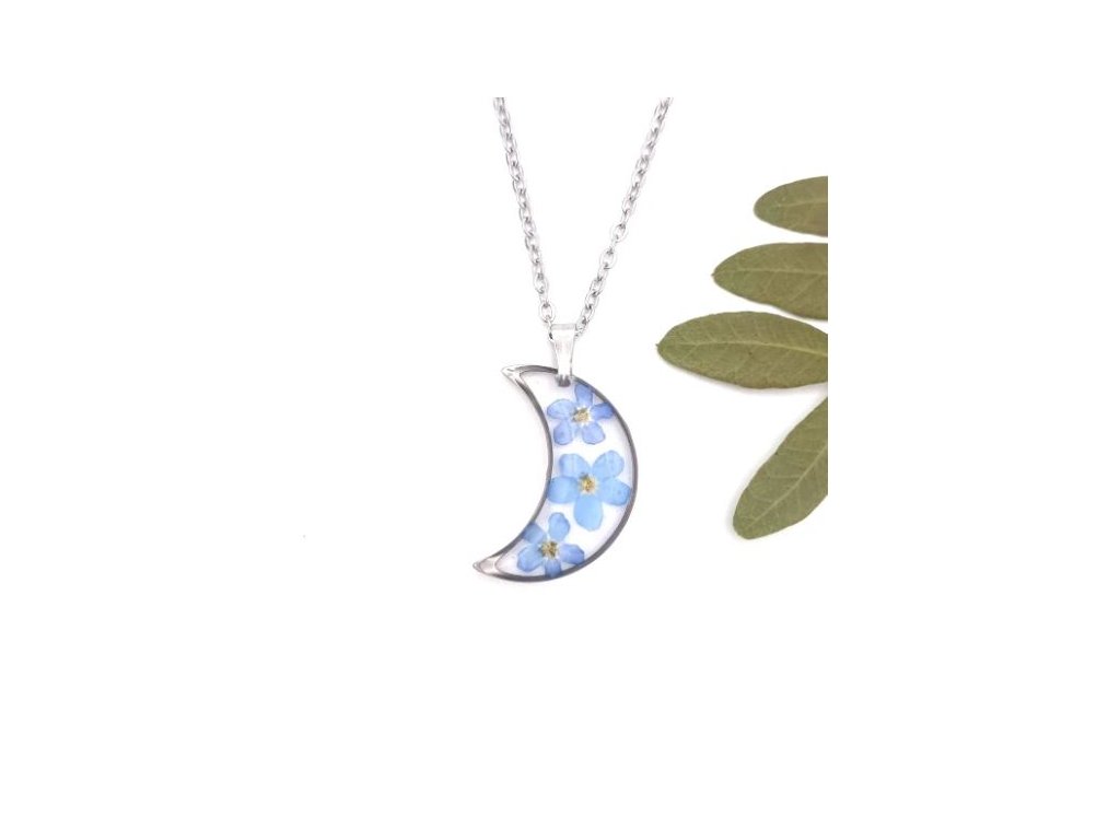 Drobné nezábudky zaliate živicou v tenkom oceľovom rámčeku v tvare menšieho mesiačika, navlečené na tenučkej retiazke
