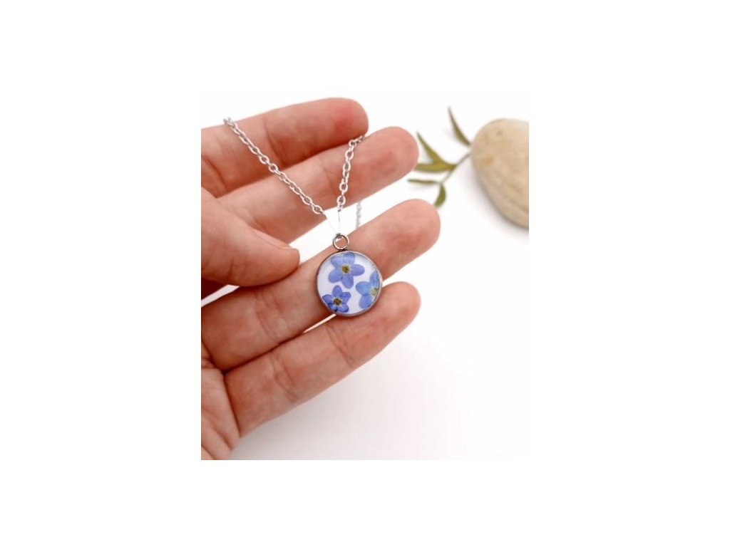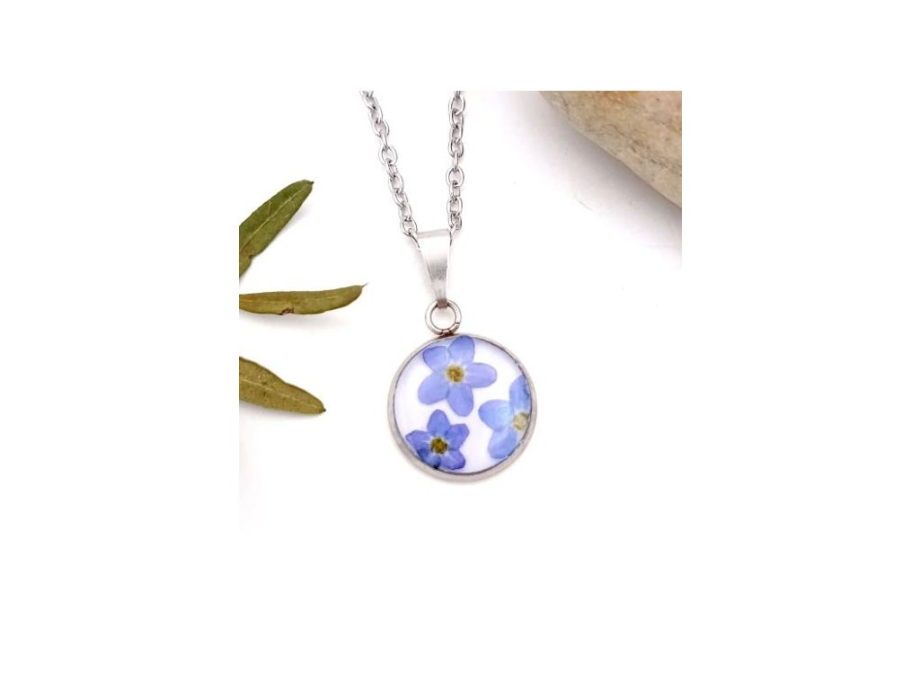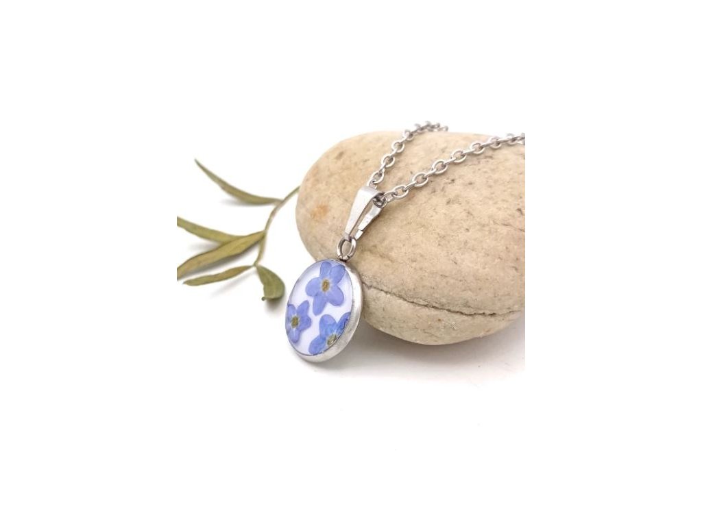 Drobné nezábudky zaliate živicou v tenkom oceľovom rámčeku v tvare menšieho mesiačika, navlečené na tenučkej retiazke