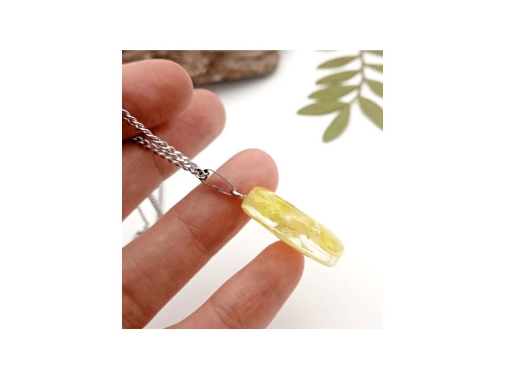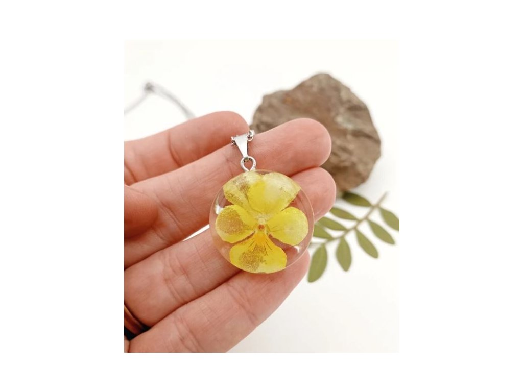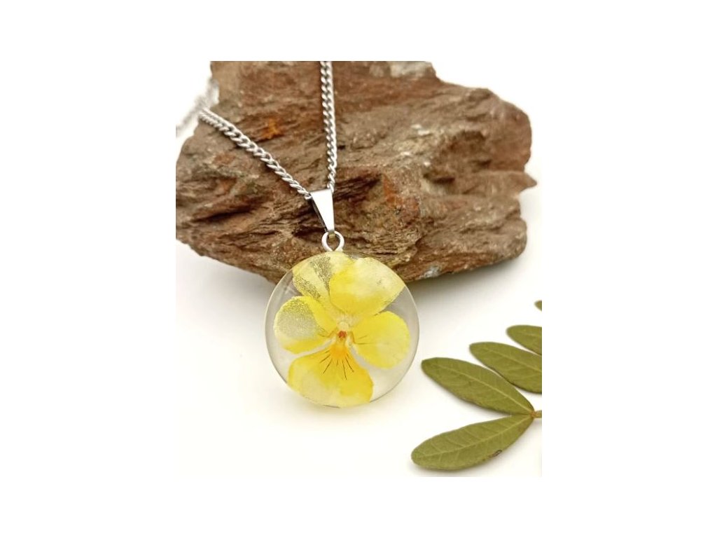 Nádherný, jemný a ženský náhrdelník so skutočným kvietkom violky v žltých tónoch sa hodí do každého