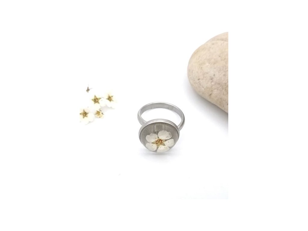 Z drobného kvietku bieleho tavoľníka vznikol tento zaujímavý prstienok.