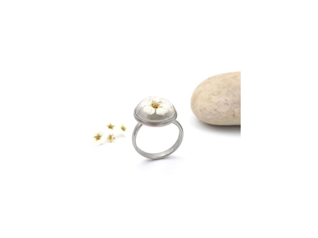 Kvet je zaliaty v živici v lôžku na veľkostne prispôsobivej obrúčke z chirurgickej ocele.